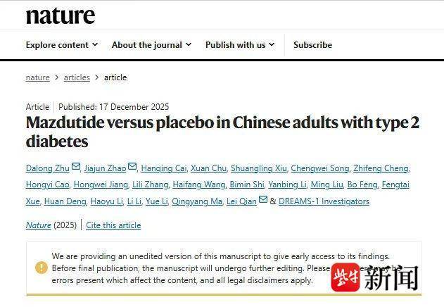 12月18日,国产自主研发的创新双靶点减重药——玛仕度肽,登上国际权威学术期刊《Nature(自然)》主刊。这一成果,标志着中国原创药物研究再次 获得全球顶级学术舞台的高度关注。 临床研究结果显示,在治疗48周后,患者肝脏脂肪含量平均下降80.2%,展现出显著的代谢改善效果。 从登上国际顶级期刊封面,到在头对头临床研究中取得优势结果,国产创新药正以真实、可验证的数据,持续拓展治疗边界,为患者带来更优、更可及的 健康选择。 钱镭表示,玛仕度肽此前已先后获得《自然》和《新英格兰医学杂志》两大顶级期刊的认可。这不仅是对单一产品的肯定,也标志着我国在代谢性疾病治 疗领域,正从"参与国际竞争"迈向"形成引领能力"。 扬子晚报/紫牛新闻记者 张添翼 作为全球最具影响力的科学周刊之一,《自然》杂志长期被视为基础科学和前沿医学突破的"风向标"。国产创新药能够登上这一位置,本身就是对其科学 价值和临床意义的国际化认可。 信达生物制药集团综合管线首席研发官钱镭介绍,多项研究数据显示,玛仕度肽提供的是更适合中国人体质特征的减重与降糖方案。中国患者以腹型肥胖 为主,往往伴随多种代谢异常。玛仕度肽通过精准调动GCG受体这一"能量开关" ...