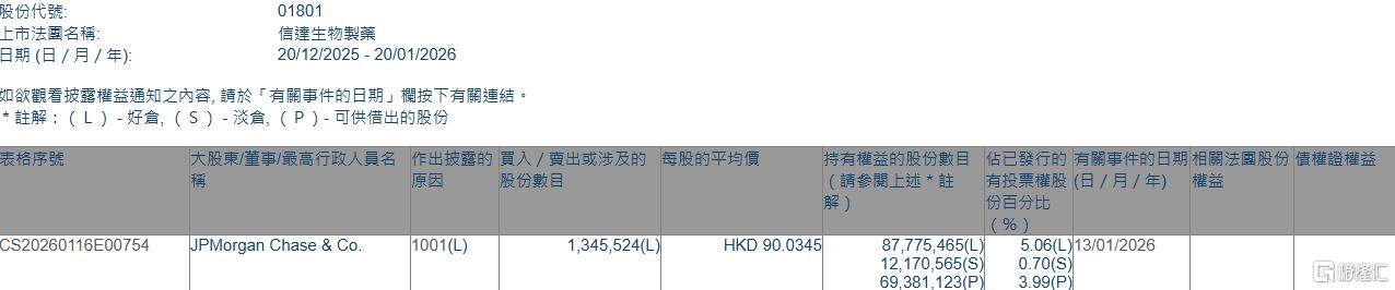 核心事件:摩根大通增持信达生物股份 - 2026年1月13日,JPMorgan Chase & Co. 以每股均价90.0345港元增持信达生物(01801.HK)好仓1,345,524股,涉资约1.21亿港元 [1] - 增持后,摩根大通最新持好仓数目增至87,775,465股,持好仓比例由4.98%上升至5.06% [1] 股东权益变动详情 - 根据联交所在2025年12月20日至2026年1月20日期间的权益披露资料,此次增持主体为JPMorgan Chase & Co. [2] - 披露表格显示,除好仓外,摩根大通还持有12,170,565股淡仓(占已发行股份0.70%)以及69,381,123股可供借出的股份(占已发行股份3.99%)[3]