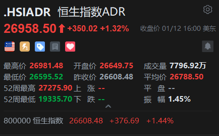 恒生指数ADR市场表现 - 恒生指数ADR于01月12日美东时间16:00收报26958.50点,较上一交易日上涨350.02点,涨幅为1.32% [1] - 当日交易区间为26595.52点至26981.48点,振幅为1.45%,成交量为7796.92万股 [1] - 恒生指数ADR价格较香港市场恒生指数收盘价26608.48点呈现溢价 [1] 主要蓝筹股ADR价格变动 - 腾讯控股ADR换算价为642.413港元,较其港股收盘价623.000港元溢价19.413港元或3.12% [2][3] - 汇丰控股ADR换算价为126.783港元,较其港股收盘价124.100港元溢价2.683港元或2.16% [2][3] - 阿里巴巴-W ADR换算价为162.075港元,较其港股收盘价154.300港元溢价7.775港元或5.32% [3] - 美团-W ADR换算价为107.043港元,较其港股收盘价105.000港元溢价2.043港元或6.60% [3] - 快手-W ADR换算价为83.615港元,较其港股收盘价80.250港元溢价3.365港元或7.43% [3] 金融板块ADR表现 - 建设银行ADR换算价为7.757港元,较港股溢价0.037港元 [3] - 工商银行ADR换算价为6.241港元,与港股价格6.240港元基本持平 [3] - 中国银行ADR换算价为4.459港元,较港股溢价0.019港元 [3] - 招商银行ADR换算价为50.526港元,较港股溢价0.176港元 [3] - 友邦保险ADR换算价为85.135港元,较港股溢价1.435港元 [3] - 中国平安ADR换算价为69.453港元,较港股溢价0.953港元 [3] 科技与消费板块ADR表现 - 网易-S ADR换算价为227.308港元,较港股溢价4.108港元 [3] - 百度集团-SW ADR换算价为148.383港元,较港股溢价3.683港元 [3] - 京东集团-SW ADR换算价为119.790港元,较港股溢价2.890港元 [3] - 小米集团-W ADR换算价为39.465港元,较港股溢价0.725港元 [3] - 携程集团-S ADR换算价为615.594港元,较港股溢价8.594港元 [3] - 比亚迪股份ADR换算价为96.986港元,较港股溢价1.286港元 [3] 其他重点公司ADR表现 - 香港交易所ADR换算价为434.253港元,较港股溢价8.053港元 [3] - 新鸿基地产ADR换算价为108.290港元,较港股溢价1.690港元 [3] - 中银香港ADR换算价为39.929港元,较港股溢价0.229港元 [3] - 紫金矿业ADR换算价为39.999港元,较港股溢价0.719港元 [3]