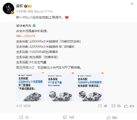 小米汽车新一代SU7安全性能配置 - 公司强调安全是产品的基础和前提,新一代SU7在安全性能上有所提升 [1] - 新一代SU7全系标配2200MPa小米超强钢“内嵌式防滚架” [1] - 新一代SU7全系标配2200MPa小米超强钢车门防撞梁 [1] - 新一代SU7全系标配1500MPa防刮底横梁 [1] - 新一代SU7全系标配电池底部“防弹涂层” [1] - 新一代SU7全系标配9个安全气囊 [1] - 公司创始人雷军确认新一代SU7安全性能再提升 [1]