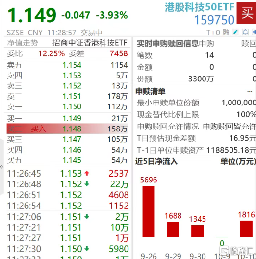 港股震荡走低,恒生科技指数跌超3%,恒生指数现跌2.5%。舜宇光学科技、药明康德跌超7%,比亚迪 电子、小米集团、哔哩哔哩等跌超6%。 截至午间收盘,港股科技50ETF(159750)跌3.93%,成交1.15亿元,行情数据显示,盘中资金逆势净 流入近3800万元。 | 1.149 -0.047 -3.93% | | | 港股科技50ETF | | ਐ | | --- | --- | --- | --- | --- | --- | | | | | 159750 | | | | SZSE CNY 11:28:57 交易中 | | | | | T+0 融 √ Q + | | 净值走势 招商中证香港科技ETF | | | 实时申购赎回信息申购 | | 赎回 | | 委比 | 12.25% 委左 | 7458 | 笔数 | 14 | 0 | | 卖五 | 1.154 | 1154 | 金额 | 0 | | | 卖四 | 1.153 | 5万 | 份额 | 3300万 | | | 变一 | 1.152 | 13万 | 申赎清单 | | | | 卖二 | 1.151 | 178万 | 最小申赎单位份额 | | 1,000 ...
