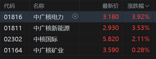| 代码 | 名称 | 最新价 | 涨跌幅 √ | | --- | --- | --- | --- | | 01816 | 中广核电力 (• | 3.180 | 3.92% | | 01811 | 中广核新能源 | 2.930 | 3.53% | | 02302 | 中核国际 | 5.820 | 2.11% | | 01164 | 中广核矿业 | 3.590 | 0.28% | 在此进程中,中国作为全球少数拥有完整核电工业体系的国家,正发挥着不可或缺的作用。截至目前, 我国在运核电机组达59台,总装机容量为6248万千瓦;核准在建机组53台,装机容量达6293万千瓦,总 装机规模已突破1.25亿千瓦,连续保持世界第一。 港股核电股普遍上涨,其中,中广核电力涨4%,中广核新能源涨3.5%,中核国际涨超2%,中广核矿业 跟涨。 消息上,国家能源局核电司司长曾亚川日前介绍,2024年全球核电发电量已创近十年新高,且增势预期 依然强劲。多家国际权威机构连续四年上调核能发展预期,预计到2050年,全球核电装机规模将突破9 亿千瓦,实现翻倍增长。 ...