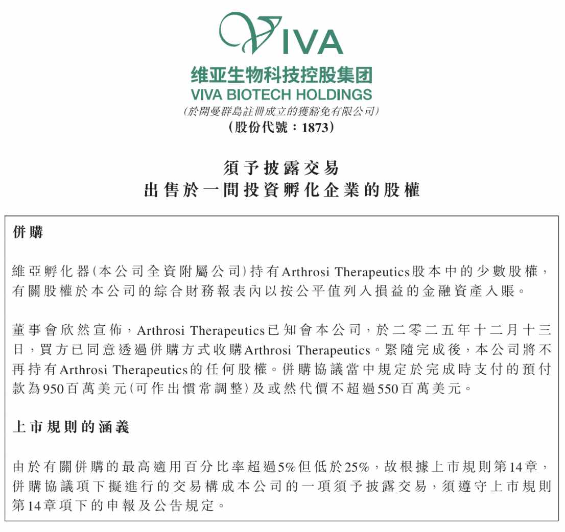 核心交易概述 - 维亚生物投资的临床阶段生物技术公司Arthrosi Therapeutics将被Sobi US Holding Corp以并购方式收购 交易预计于2025年12月13日完成 [1] - 交易对价包括9.5亿美元预付款以及不超过5.5亿美元的或然代价 总对价最高可达15亿美元 [1] - 交易完成后 维亚生物将不再持有Arthrosi Therapeutics的任何股权 [1] 被收购公司情况 - Arthrosi Therapeutics是一家聚焦于痛风药物开发的临床阶段生物技术公司 [1] - 其核心产品为pozdeutinurad 是一种潜在同类最优、高效且高选择性的新一代URAT1抑制剂 旨在降低进行性痛风患者的血清尿酸水平、减少急性发作及痛风石 [1] - 截至公告日期 维亚生物通过其孵化器平台持有Arthrosi Therapeutics约3.14%的股权(按悉数摊薄及转换后的基准计算) [1] 交易对公司的影响与资金用途 - 公司董事认为 此次并购能够令集团变现其自投资以来长期累积于Arthrosi Therapeutics的投资价值 [2] - 此次交易被视为当前加强集团财务灵活性的机会 [2] - 集团拟将自并购收到的所得款项用于补充集团的营运资金 并支持集团其他投资及孵化业务的增长与发展 [2]