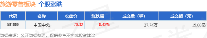 从资金流向上来看,当日旅游零售板块主力资金净流入8260.14万元,游资资金净流出5750.73万元,散户 资金净流出2509.4万元。旅游零售板块个股资金流向见下表: 证券之星消息,10月20日旅游零售板块较上一交易日上涨0.43%,中国中免领涨。当日上证指数报收于 3863.89,上涨0.63%。深证成指报收于12813.21,上涨0.98%。旅游零售板块个股涨跌见下表: | 代码 | 名称 | 收盘价 | | 涨跌幅 | 成交量(手) | | 成交额(元) | | | --- | --- | --- | --- | --- | --- | --- | --- | --- | | 601888 | 中国中免 | | 70.32 | 0.43% | | 27.74万 | | 19.66亿 | | 代码 名称 主力净流入(元) 主力净占比 游资净流入(元) 游资净占比 散户净占比 | | | | | | | | --- | --- | --- | --- | --- | --- | --- | | 601888 中国中免 | 8260.14万 | 4.20% | -5750.73万 | -2.93% | -2 ...