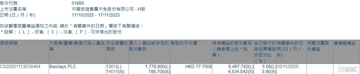 交易核心信息 - Barclays PLC于2025年11月10日增持中国中免H股1,778,800股 [1][2] - 增持每股平均价格为77.7508港元,总金额约1.38亿港元 [1][2] - 增持后,Barclays PLC持好仓数目增至6,467,742股 [1][2] 股权变动详情 - 增持后,Barclays PLC持好仓比例由4.33%上升至5.56% [1] - 披露表格同时显示Barclays PLC持有淡仓(空头仓位)4,534,542股 [2]