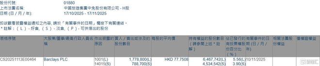 公司股权变动 - Barclays PLC于2025年11月10日增持中国中免(01880 HK)好仓177 88万股[1] - 增持每股均价为77 7508港元 总涉资约1 38亿港元[1] - 增持后 Barclays PLC持好仓数目增至6 467 742股 持好仓比例由4 33%上升至5 56%[1] - 同日 Barclays PLC亦减持789 700股淡仓 减持后淡仓持股为4 534 542股 占已发行股份比例为3 90%[2]