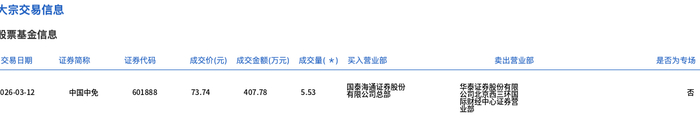 大宗交易概况 - 2024年3月12日,中国中免发生一笔大宗交易,成交量为5.53万股,成交金额为407.78万元,占该股当日总成交额的0.23% [1] - 该笔大宗交易的成交价格为73.74元,与当日市场收盘价73.74元持平 [1] 交易细节 - 交易证券为中国中免,证券代码为601888 [2] - 买入营业部为国泰港湾运营股份,卖出营业部为讀購購 [2] - 该笔交易被标记为“专场”交易 [2]
