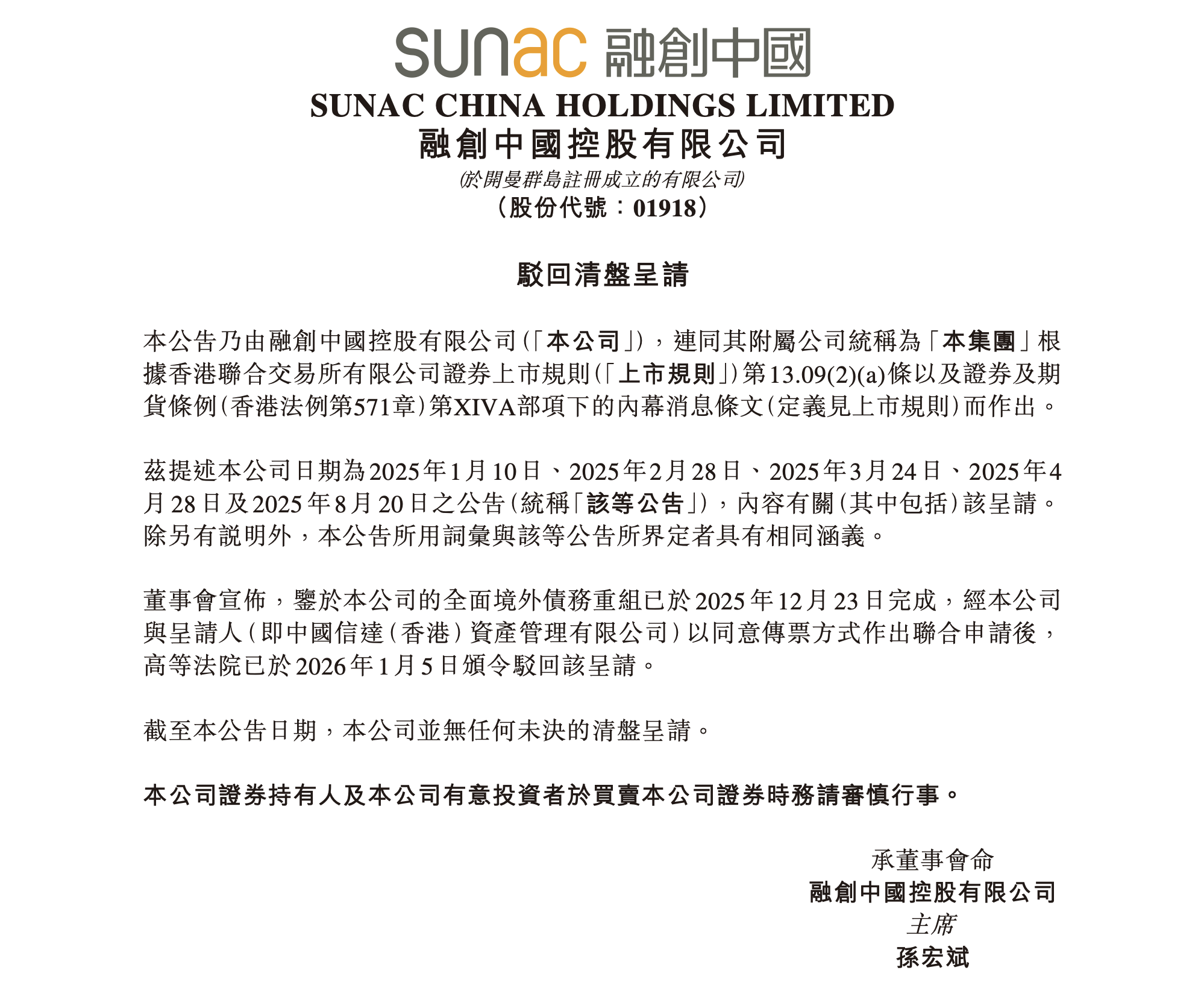值得注意的是,1月5日上午,香港法院驳回针对融创中国的清盘呈请。此前,融创中国在港交所公告, 全面境外债务重组的所有先决条件均已达成,重组生效日期已于2025年12月23日落实。公司约96亿美元 的现有债务已获全面解除及免除。2025年1月,融创中国收到中国信达(香港)资产管理有限公司在香港 对公司提出的清盘呈请。其后,香港高等法院多次将清盘呈请聆讯延后,直至2026年1月5日。 融创中国(01918)现跌超6%,截至发稿,跌6.77%,报1.24港元,成交额3.15亿港元。 消息面上,融创中国公布,12月份,实现合同销售金额29.5亿人民币,同比增加68.6%;合同销售面积 约27.2万平方米,增加97.1%;销售均价每平方米10,850元,下降14.4%。2025年度,累计实现合约销售 金额368.4亿元,同比下降21.8%;涉及销售面积约145.3万平方米,减少35.7%;销售均价每平方米 25,350元,上升21.6%。 ...