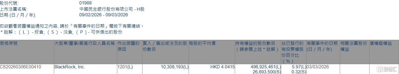 贝莱德减持民生银行(01988)约1030.82万股 每股作价约4.04港元