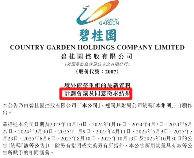 从首次披露方案到最终债权人批准,碧桂园用300天时间完成了177亿美元境外债务的重组闯关。11月6日,碧桂 园发布公告称,其境外债务重组方案在5日的债权人会议上顺利通过。两个债务组别均以超过75%的赞成票通过 方案,其中美元债组别支持率高达96.03%。这意味着,这家头部民营房企的境外债务重组跨过最关键的一道 坎。记者了解到,此次纳入境外重组范围的债务规模合计约177亿美元,折合人民币约1270亿元。接下来,12月 4日的法院裁定聆讯,将成为最终重组落地前的最后一环。如若通过,碧桂园或将真正实现轻装上阵。 (股份代號:2007) 境外債務重組的最新資料 計劃會議及同意徵求結果 本公告乃由碧桂園控股有限公司(本公司];連同其附屬公司統稱「本集團」自願作 品。 茲提述本公司日期為2023年10月10日、2024年1月16日、2024年4月7日、2024年6月 27日、2024年9月30日、2025年1月9日、2025年4月11日、2025年5月9日、2025年5 月23日、2025年6月6日、2025年8月18日、2025年10月13日及2025年10月30日的公 告(統稱[該等公告])。除另有指明或文義另有所指 ...