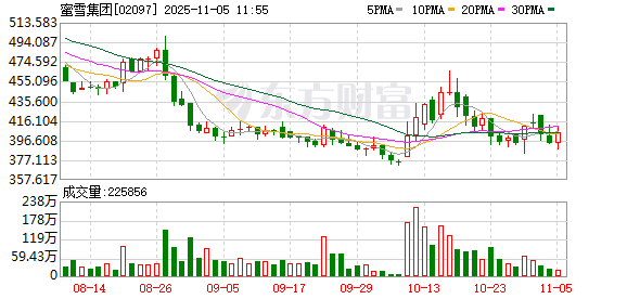 股价表现 - 蜜雪集团(02097 HK)股价午前上涨近3% 截至发稿时上涨2.79%至405港元 [2] - 公司股票成交额为8743.21万港元 [2]