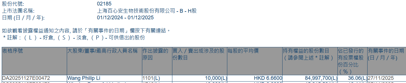 香港联交所最新数据显示,11月27日,Wang Philip Li增持百心安-B(02185)1万股,每股作价6.66港元,总金额6.66万港元。增持后最新持股数目为8499.77万 股,持股比例为36.06%。 | 表格序號 | 大股東/董事/最高行政人員名稱 作出披露的 買入 / 賣出或涉及的股 每股的平均價 | | | | 持有權益的股份 | | --- | --- | --- | --- | --- | --- | | | 份數目 | 泉大 | | | 語參閱 | | DA20251127E00472 | Wang Philip Li | 1101(L) | 10.000(L | HKD 6.6600 | 84.99 | ...