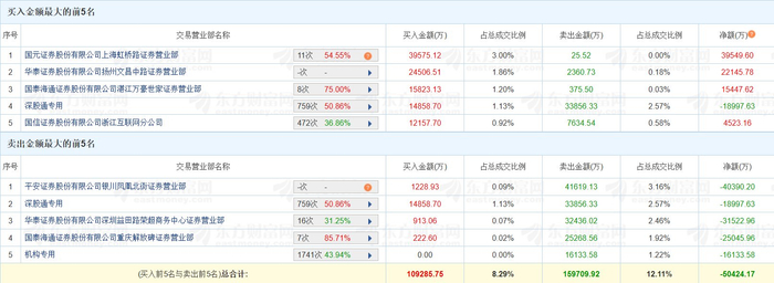 | 买入金额最大的前5名 | | | | | | | | | | --- | --- | --- | --- | --- | --- | --- | --- | --- | | 序号 | 交易营业部名称 | | | 买入金额(万) | 占总成交比例 | 类出金Ⅰ(万) | 占总成交比例 | 净额(万)0 | | 国元证券股份有限公司上海虹桥路证券营业部 | | 11次 54,55% | 0 | 39575.12 | 3.00% | 25.52 | 0.00% | 39549.60 | | 2 | 华泰证券股份有限公司扬州文昌中路证券营业部 | 4 . | A | 24506.51 | 1.86% | 2360.73 | 0.18% | 22145.78 | | 3 | 国泰海通证券股份有限公司港江万豪世家证券营业部 | 85% 75,00% | > | 15823.13 | 1.20% | 375.50 | 0.03% | 15447.62 | | 深胶通专用 | | 759次 50.86% | | 14858.70 | 1.13% | 33856.33 | 2.57% | -18997.63 | | 5 | ...