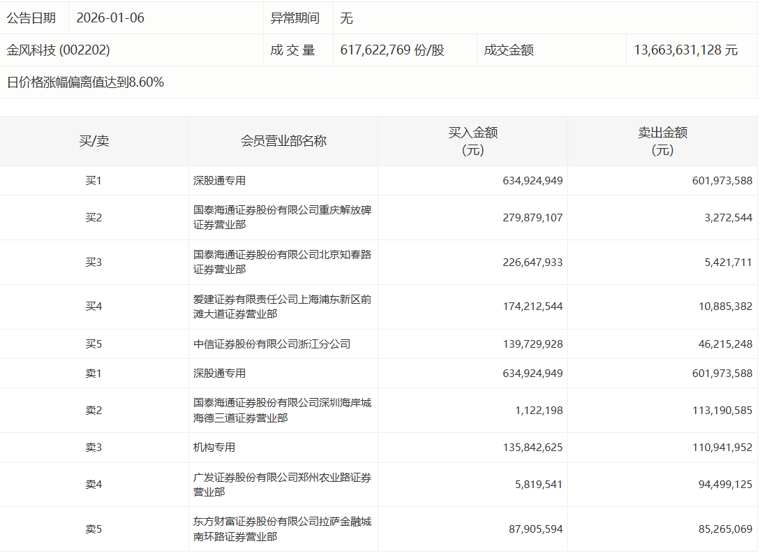 | 公告日期 | 2026-01-06 | 异常期间 无 | | | | | --- | --- | --- | --- | --- | --- | | 金风科技 (002202) | | 成交量 | 617,622,769 份/股 | 成交金额 | 13,663,631,128 元 | 人民财讯1月6日电,金风科技(002202)今日涨停,成交额136.64亿元,盘后龙虎榜数据显示,深股通专用席位买入6.35亿元并卖出6.02亿元,1家机构专 用席位净买入2490.07万元。 | 卖出全额 | 买入金额 | 会员营业部名称 | 州委 | (元) | (元) | | --- | --- | --- | --- | --- | --- | | 买1 | 深股通专用 | 634,924,949 | 601,973,588 | | | | 国泰海通证券股份有限公司重庆解放碑 | 买2 | 279,879,107 | 3,272,544 | 证券营业部 | | | 国泰海通证券股份有限公司北京知春路 | 253 | 226.647.933 | 5,421,711 | 证券营业部 | | | 爱建证券有限责任公司上海浦 ...