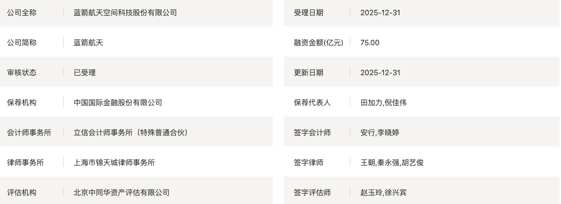 抢在马斯克之前,"中国版SpaceX"率先开始IPO进程。 2025年12月31日,上交所官网显示,蓝箭航天空间科技股份有限公司(以下简称"蓝箭航天")IPO上市申请已经被受理;2026年1月5日,中证协发布"2026年 第一批首发企业现场检查抽查名单",蓝箭航天被抽中现场检查。 | 公司全称 | 蓝箭航天空间科技股份有限公司 | 受理日期 | 2025-12-31 | | --- | --- | --- | --- | | 公司简称 | 蓝箭航天 | 融资金额(亿元) | 75.00 | | 审核状态 | 已受理 | 更新日期 | 2025-12-31 | | 保荐机构 | 中国国际金融股份有限公司 | 保荐代表人 | 田加力,倪佳伟 | | 会计师事务所 | 立信会计师事务所 (特殊普通合伙) | 签字会计师 | 安行,李晓婷 | | 律师事务所 | 上海市锦天城律师事务所 | 签字律师 | 王朝,秦永强,胡艺俊 | | 评估机构 | 北京中同华资产评估有限公司 | 签字评估师 | 赵玉玲,徐兴宾 | 蓝箭航天是上交所发布《上海证券交易所发行上市审核规则适用指引第9号——商业火箭企业适用科创板第五套上市标 ...