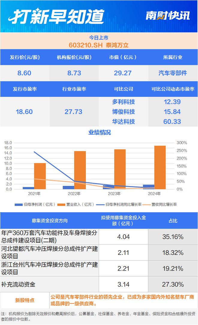 公司基本情况 - 泰鸿万立于4月9日在上证主板上市,股票代码603210.SH [1] - 公司是一家专注于汽车结构件与功能件研发、生产与销售的高新技术企业 [1] - 公司具备多种总成零部件以及模具的研发、设计和生产能力 [1] 发行与估值数据 - 发行价为8.60元/股,机构报价为8.73元/股 [2] - 发行市值为29.27亿元 [2] - 发行市盈率为18.60倍,低于行业市盈率27.73倍 [2] - 可比公司多利科技、博俊科技、华达科技的动态市盈率分别为12.39倍、15.84倍、60.33倍 [2] 业务与市场地位 - 主要产品为汽车结构件和功能件,是汽车车身、底盘的主要组成构件,属于关键零部件 [3] - 产品配套的整车厂覆盖自主品牌、外资品牌以及新能源造车新势力,具备为新能源车和传统燃油车配套的能力 [3] - 2021年至2024年上半年,部分关键产品的市场占有率如下:前地板结构件占有率在3.10%至4.40%之间,后地板结构件在4.33%至5.50%之间,后轮罩结构件在0.66%至1.21%之间,制动踏板总成在2.96%至4.75%之间 [3] - 主要客户为国内外知名品牌整车制造厂及部分配套零部件供应商,与吉利集团、长城汽车、上汽集团、广汽集团等优质客户建立了长期稳定的合作关系 [3] 客户集中度情况 - 2021年至2024年上半年,公司对前五大客户的主营业务收入金额占比分别为97.01%、95.37%、94.36%和89.02%,客户集中度较高 [4] - 同期,对吉利集团的主营业务收入金额占比分别为35.91%、46.11%、38.71%和33.62% [4] - 同期,对长城汽车的主营业务收入金额占比分别为51.64%、35.48%、36.25%和30.18% [4] 募集资金用途 - 募集资金将投资于四个项目,拟使用募集资金投入金额合计11.50亿元 [2] - 年产360万套汽车功能件及车身焊接分总成件建设项目(二期)拟投入4.04亿元,占比35.16% [2] - 河北望都汽车冲压焊接分总成件扩产建设项目拟投入2.11亿元,占比18.32% [2] - 浙江台州汽车冲压焊接分总成件扩产建设项目拟投入2.21亿元,占比19.21% [2] - 补充流动资金拟投入3.14亿元,占比27.30% [2]