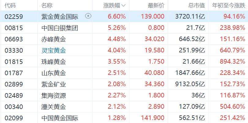 现货黄金再创历史新高价4060美元,黄金股逆势上涨!紫金黄金国际涨超6%,山东黄金、紫金矿业、集海资源、潼关黄金涨超2%