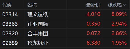 港股异动丨纸业股拉升 理文造纸绩后涨超8%领衔 特种纸行业密集提价