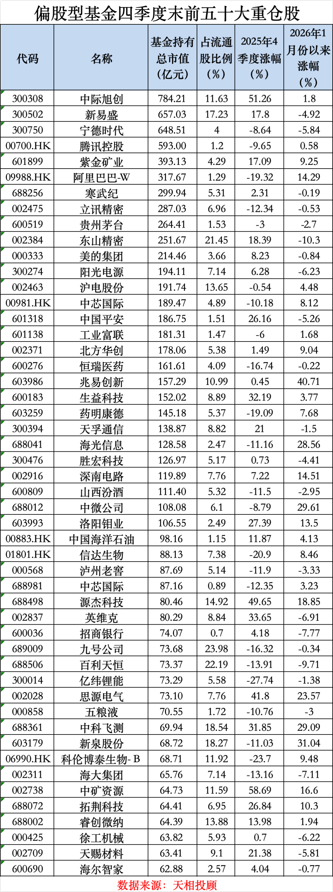 公募基金2025年四季度持仓核心变化 - 在科技股牛市推动下,光模块巨头中际旭创和新易盛取代宁德时代和腾讯控股,成为偏股型基金第一和第二大重仓股,宁德时代和腾讯控股退居第三和第四位 [1] - 信息技术板块在四季度获得基金较多增持,增持榜前五名中有4只个股属于该板块 [1] - 偏股型基金前十大重仓股依次为:中际旭创、新易盛、宁德时代、腾讯控股、紫金矿业、阿里巴巴-W、寒武纪、立讯精密、贵州茅台、东山精密 [1] 前五十大重仓股持仓详情 - 截至四季度末,公募基金持有中际旭创总市值达784.21亿元,占流通股比例11.63%,该股四季度股价上涨51.26% [2] - 公募基金持有新易盛总市值657.03亿元,占流通股比例17.23%,四季度股价上涨17.8% [2] - 公募基金持有宁德时代总市值648.51亿元,占流通股比例4%,四季度股价下跌8.64% [2] - 公募基金持有腾讯控股总市值593.00亿元,占流通股比例1.2%,四季度股价下跌9.65% [2] - 前二十大重仓股还包括紫金矿业、阿里巴巴-W、寒武纪、立讯精密、贵州茅台、东山精密、美的集团、阳光电源、沪电股份、中芯国际、中国平安、工业富联、北方华创、恒瑞医药、兆易创新、生益科技等 [2][3] 基金重点增持方向与个股 - 从增持市值看,四季度偏股型基金增持最多的50只股票主要集中在信息技术、有色、化工等细分领域 [4] - 中际旭创以226.02亿元的增持市值位居第一,尽管基金持股数量环比减少7.02%,但因股价飙升51.26%,持股市值从558.13亿元增至784.21亿元 [4] - 中国平安增持市值105.37亿元,是唯一挤入前二十大重仓股的“新面孔”,排名从第41名升至第15名,基金持股数量环比增长84.88%至2.73亿股,重仓基金数量环比增长126.25%至681只 [4][6] - 东山精密增持市值101.97亿元,基金持股数量环比增长42.00%至2.97亿股,重仓基金数量环比增长59.00%至318只 [6] - 新易盛增持市值96.26亿元,生益科技增持市值60.17亿元,紫金矿业增持市值53.17亿元 [5] - 多只四季度股价翻倍股获大幅增持:天华新能四季度股价上涨118.53%,基金持有市值从1175.94万元增至40.35亿元,重仓基金数量从2只增至93只;迈为股份四季度股价上涨107.34%,基金持有市值从1.83亿元增至40.35亿元,重仓基金数量从8只增至54只 [7] - 增持市值居前的个股还包括云铝股份、思源电气、中矿资源、中国东航、寒武纪、洛阳钼业、佰维存储、源杰科技、中国太保、天赐材料、阳光电源、英维克等 [5][6] 基金重点减持方向与个股 - 去年四季度恒生科技指数表现疲软,多只权重股遭减持,减持榜前十名中的阿里巴巴-W、腾讯控股、中芯国际、小米集团均为恒生科技指数成份股 [8] - 阿里巴巴-W遭减持市值最大,达183.46亿元,四季度股价下跌19.32% [9] - 工业富联遭减持182.19亿元,四季度股价下跌6% [9] - 宁德时代遭减持110.13亿元,四季度股价下跌8.64% [9] - 亿纬锂能遭减持108.04亿元,四季度股价下跌27.74% [9] - 腾讯控股遭减持106.18亿元,四季度股价下跌9.65% [9] - 中芯国际遭减持101.58亿元,四季度股价下跌10.18% [9] - 其他遭显著减持的个股包括立讯精密、小米集团-W、分众传媒、信达生物、恒瑞医药等 [9][10]