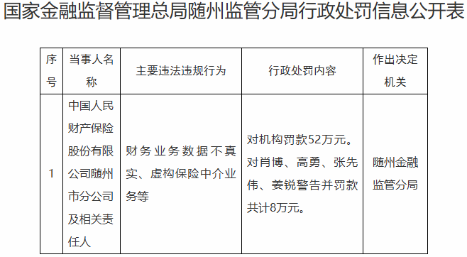 行政处罚事件概述 - 国家金融监督管理总局随州监管分局对中国人民财产保险股份有限公司随州市分公司及相关责任人作出行政处罚 [1] - 行政处罚原因为公司财务业务数据不真实、虚构保险中介业务等 [1] - 随州金融监管分局对机构罚款人民币52万元 [1][2] - 对相关责任人肖博、高勇、张先伟、姜锐给予警告并罚款共计人民币8万元 [1][2]