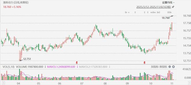 方正证券研报指出,潍柴动力获Ceres SOFC制造许可,开辟电力能源又一增长极。该行还称,今年以 来,公司业绩稳健增长,前三季度营收、归母净利润同比分别增长5%、6%,全年盈利突破120亿元的 预期进一步强化。当前PE估值不足12倍,处于近三年40%分位以下,具备较高安全边际。随着明年年初 新能源重卡渗透率收敛,主业中长期悲观预期有望扭转,估值修复空间可观。维持"推荐"评级。 延续近日强势,潍柴动力(2338.HK)今早跳空高开超5%,报18.76港元,股价创2021年3月以来新高。 消息面上,11月5日,Ceres Power宣布与潍柴动力签署固体氧化物燃料电池(SOFC)制造许可协议,进一 步巩固双方既有合作关系。潍柴方面将建立新工厂生产电池与电堆,面向数据中心、商业及工业用电市 场,预计相关收入将于2026财年确认。 ...
