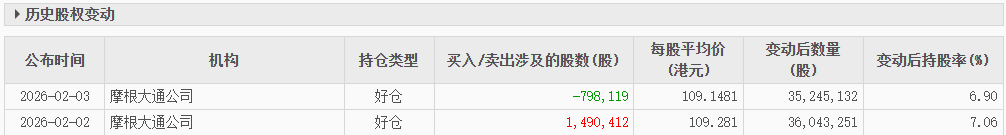 公司股权变动 - 摩根大通于2月3日减持药明康德79.8119万股 [1] - 减持平均每股作价为109.1481港元,总金额约为8711.32万港元 [1] - 减持后摩根大通最新持股数目约为3524.51万股,持股比例降至6.90% [1]