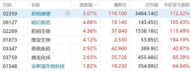 港股市场医药外包概念股集体走强,其中,药明康德涨5%,昭衍新药、药明生物、维亚生物涨超4%, 泰格医药、康龙化成涨超2%。 消息面上,药明康德公布2025年第三季度营收120.57亿元,同比增15.26%;归属于上市公司股东的净利 润35.15亿元,同比增长53.27%。前三季度营收328.57亿元,同比增18.61%;归属于上市公司股东的净 利润120.76亿元,同比增84.84%。 此外,药明康德全资子公司上海药明拟以28亿元的基准股权转让价款,向上海世和融企业管理咨询有限 公司及上海世和慕企业管理咨询有限公司转让其所持有的上海康德弘翼医学临床研究有限公司和上海药 明津石医药科技有限公司100%股权。 | 代码 | 名称 | | 涨跌幅 √ | 最新价 | 总市值 | 年初至今涨跌 | | --- | --- | --- | --- | --- | --- | --- | | 02359 | 药明康德 | 0 | 5.07% | 116.100 | 3464.14亿 | 112.32% | | 06127 | 昭衍新药 | | 4.88% | 19.140 | 143.45亿 | 105.43% | | ...
