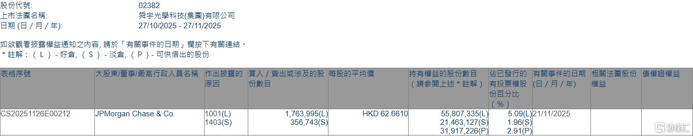 核心投资动态 - JPMorgan Chase & Co 于2025年11月21日以每股均价62.661港元增持舜宇光学科技好仓1,763,995股,涉资约1.11亿港元 [1] - 增持后,JPMorgan Chase & Co 的好仓持股数目增至55,807,335股,持好仓比例由4.93%上升至5.09% [1] 股权结构变动详情 - 此次权益变动涉及好仓(Long Position)增持1,763,995股,淡仓(Short Position)为356,743股 [2] - 权益披露日期范围为2025年10月27日至2025年11月27日,表格序号为CS20251126E00212 [2] - JPMorgan Chase & Co 通过增持好仓,其持有权益的股份数目中,好仓部分占比升至5.09%,淡仓部分占比为1.96% [2]