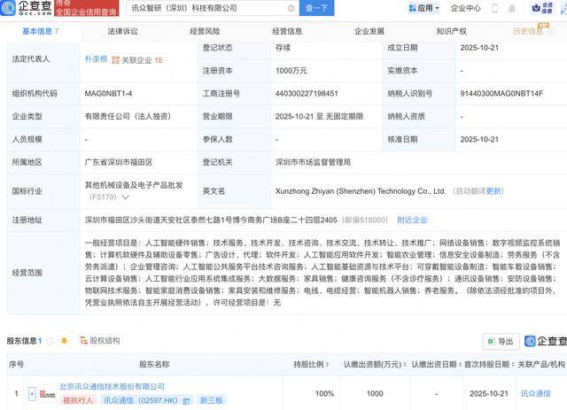 | C 北草草 全国企业体用直通 | 讯众智研(深圳)科技有限公司 ■应用、企业中心 ■ ▲ 内部 > | | 0 但一下 | | | | --- | --- | --- | --- | --- | --- | | 基本信息 7 | 法律诉讼 企业发展 | 经营风险 | 经营信息 | | 历史信息 の 知识产权 | | 法定代表人 | 朴圣根 星关联企业 18 | 登记状态 | 存缓 | 成立日期 | 2025-10-21 | | | | 注册资本 | 1000万元 | 实量资本 | | | 组织机构代码 | MAGONBT1-4 | 工商注册号 | 440300227198451 | 给税人识别号 | 91440300MAGONBT14F | | 企业类型 | 有限责任公司 (法人验资) | 营业期限 | 2025-10-21 至 无圆定期限 | 纳税人资质 | 47 | | 人员规模 | | 参保人数 | . | 核准日期 | 2025-10-21 | | 所属地区 | 广东省深圳市福田区 | 登记机关 | 深圳市市场监督管理局 | | | | 国标行业 | 其他机械设备及电子产品批发 Xunzhong ...