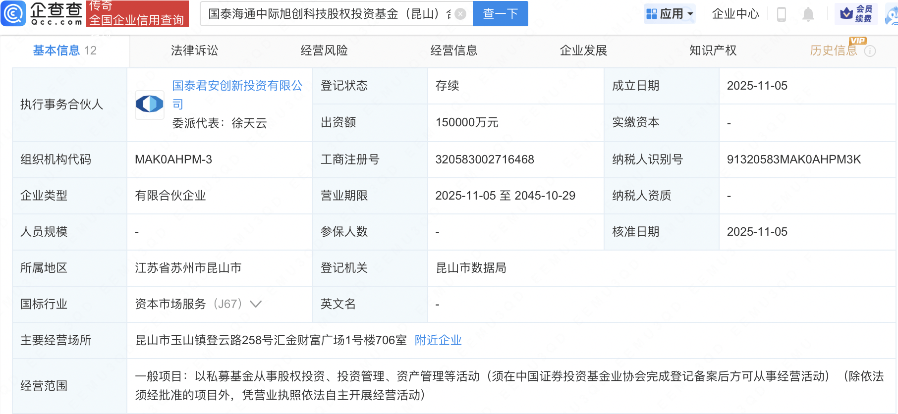 人民财讯11月6日电,企查查APP显示,近日,国泰海通中际旭创科技股权投资基金(昆山)合伙企业 (有限合伙)成立,出资额15亿元,经营范围包含以私募基金从事股权投资、投资管理、资产管理等活 动。企查查股权穿透显示,该企业由国泰海通(601211)旗下国泰君安创新投资有限公司、中际旭创 (300308)、中国太保(601601)旗下太保战新并购私募基金(上海)合伙企业(有限合伙)、太辰光 (300570)等共同出资。 ...