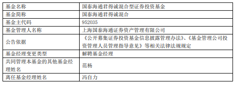 冯自力离任国泰海通资管旗下3只基金