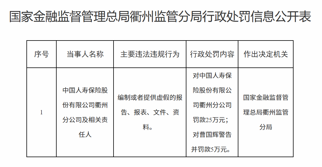 中国人寿衢州分公司被罚款25万元 因编制虚假资料