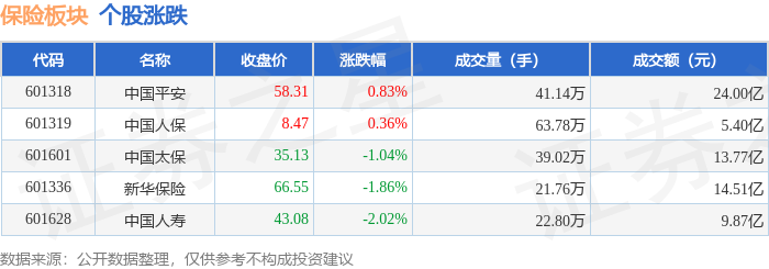证券之星消息,11月3日保险板块较上一交易日下跌0.79%,中国人寿领跌。当日上证指数报收于 3976.52,上涨0.55%。深证成指报收于13404.06,上涨0.19%。保险板块个股涨跌见下表: | 代码 | 名称 | 主力净流入 (元) | 主力净占比 游资净流入 (元) | | 游资净占比 散户净流入(元) | | 散户净占比 | | --- | --- | --- | --- | --- | --- | --- | --- | | 601318 中国平安 | | 9103.50万 | 4.50% | -1.02 Z- | -5.06% | 1136.90万 | 0.56% | | 601319 中国人保 | | 2111.95万 | 4.68% | 1007.41万 | 2.23% | -3119.78万 | -6.92% | | 601628 中国人寿 | | -1.51亿 | -18.52% | 6203.57万 | 7.64% | 8846.59万 | 10.89% | | 601601 | 中国太保 | -1.94亿 | -18.63% | 9010.11万 | 8.66% | 1.04亿 ...