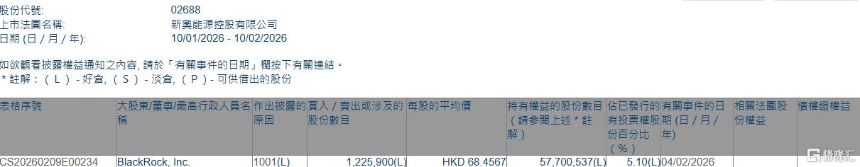 核心事件:BlackRock增持新奥能源股份 - 2026年2月4日,BlackRock, Inc.在场内增持新奥能源(02688.HK) 122.59万股[1] - 增持每股平均价为68.4567港元,涉及总金额约8392.11万港元[1] - 此次增持后,BlackRock, Inc.的最新持股数目达到5770.054万股[1] 股东权益变动详情 - 增持完成后,BlackRock, Inc.的持股比例由4.99%上升至5.10%,突破了5%的披露门槛[1] - 根据联交所权益披露表格,此次权益变动的原因代码为“1001(L)”,即“在市场上购买”[2] - 披露的权益股份数目为5770.054万股,占已发行有投票权股份的5.10%,数据日期为2026年2月4日[2]