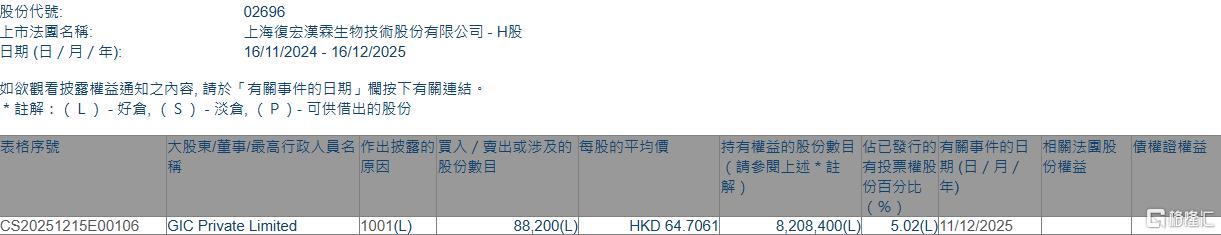 | 股份代號: | 02696 | | --- | --- | | 上市法國名稱: | 上海復宏漢霖生物技術股份有限公司 - H股 | | 日期 (日 / 月 / 年): | 16/11/2024 - 16/12/2025 | | 表格序號 | 大股東/董事/最高行政人員名 作出披露的 買入 / 賣出或涉及的 每股的平均價 | | | | | 持有權益的股份數目 佔已發行的有關事件的日 相關法團 | | | --- | --- | --- | --- | --- | --- | --- | --- | | | | | 股份數目 | | | ( 請参関上述 * 註 有投票權股 期 (日 / 月 / | | | | | | | | | 份百分比 年) | | | CS20251215E00106 | GIC Private Limited | 1001(L) | | 88.200(L) | HKD 64.7061 | 8.208.400(L) | 5.02(L)11/12/2025 | 格隆汇12月16日丨根据联交所最新权益披露资料显示,2025年12月11日,复宏汉霖(02696.HK)获GIC Private ...