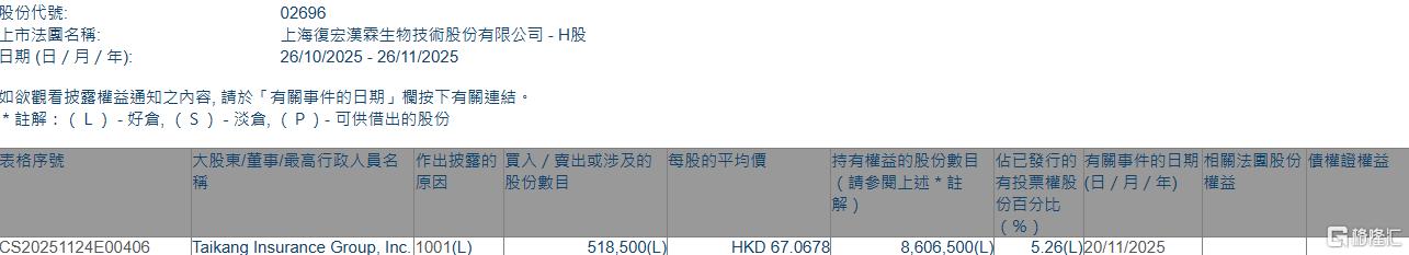 复宏汉霖(02696.HK)获Taikang Insurance Group增持51.85万股