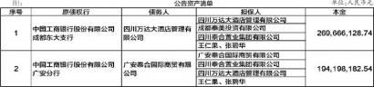 | 1422 | | 公告宣产通驗 | | 单位,人民变元 | | --- | --- | --- | --- | --- | | 序号 | 原佛取行 | 倡第人 | 相很人 | 本館 | | | 区 都东大变行 | 中国工商银行股份有限公司 四川万达大酒店管理有 解公司 | 四川万站大森店管理有限公司 成都要面收官有限公司 | 269,666,128.74 | | | | | 四川泰合置变集团有限公司 | | | | | | 王仁鳳、張聖华 | | | .2 | 广安分行 | 中国工商品行股份有限公司 广安高合国际新贸有限 公園 | 厂安新合国际商贸有限公司 四川泰合营业集团有限公司 | 194,198,182,54 | | | | | 四川万达大酒店管理有限公司 | | | | | | 王仁鼎、张静华 | | 根据中国中信金融资产管理股份有限公司四川省分公司与泉州市国投资产管理有限公司签署的 《债权转让协议》,中国中信金融资产管理股份有限公司四川省分公司已将其对下列债务人及其 担保人享有的主债权及担保合同项下的全部权利依法转让给泉州市国投资产管理有限公司。中国 中信金融资产管理股份有限公司四川省分公司与泉 ...