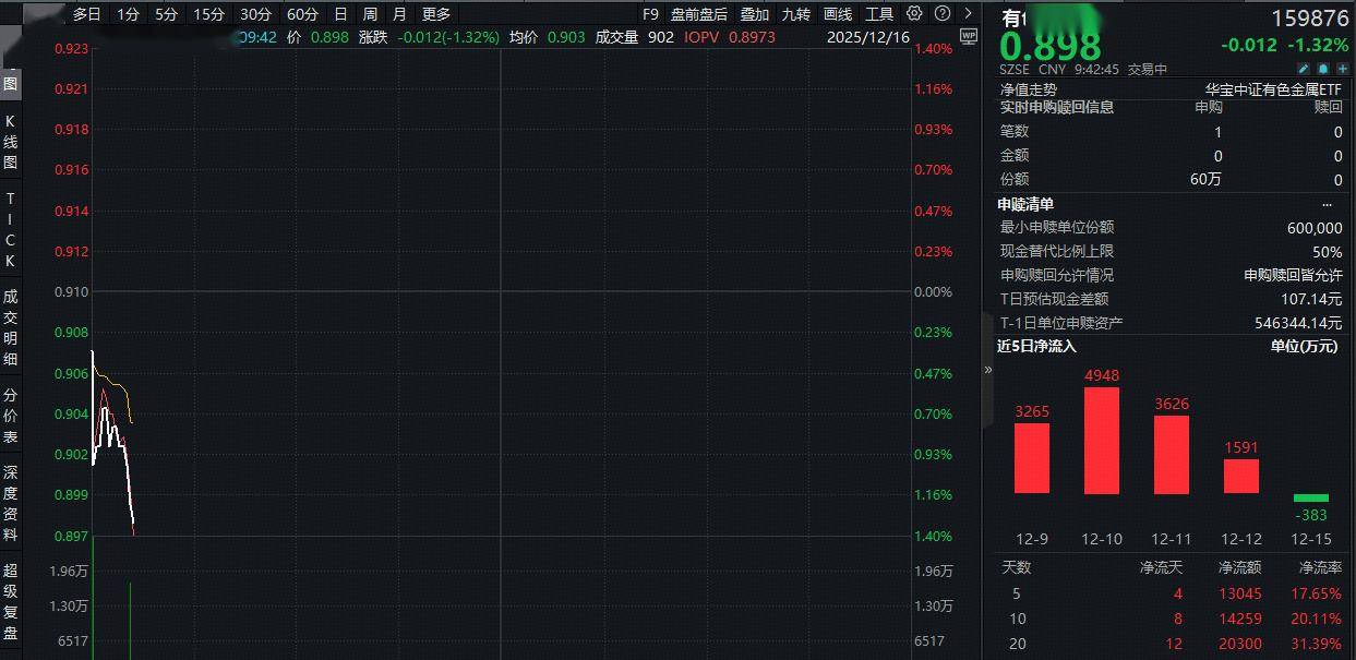 12月16日早盘,市场盘整,A股三大指数悉数飘绿,揽尽有色金属行业龙头的有色龙头ETF(159876)随市回调,场内价格现跌1.32%,值得关注的是,该 ETF近20日累计吸金2.03亿元,反映资金看好有色金属板块后市表现,积极进场布局! 成份股方面,厦门钨业、洛阳钼业领涨超1%,江西铜业、永兴材料、雅化集团等个股飘红,另一方面,西部超导跌逾4%,楚江新材、华峰铝业、西部黄金 跌超4%,跌幅居前,拖累指数表现。 | 多日 1分 5分 15分 30分 60分 日 | 周 | 月 更多 | F9 盘前盘后 叠加 九转 画线 工具 ◎ ② | 09:42 价 0.898 涨跌 -0.012(-1.32%) 均价 0.903 成交量 902 IOPV 0.8973 | 2025/12/16 | | | | --- | --- | --- | --- | --- | --- | --- | --- | | 0.923 | | | | | | | | | 國 | 0.921 | 1.1696 | 洋目元 | 实时申购陵回信息 | | | | | K 线图 | | | | | | | | | 0.918 | 0.9396 ...