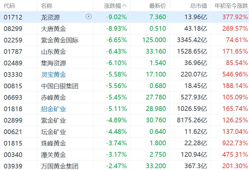 | 代码 | 名称 | | 涨跌幅 ^ | 最新价 | 总市值 | 年初至今涨跌 | | --- | --- | --- | --- | --- | --- | --- | | 01712 | 龙贺源 | 0 | -9.02% | 7.360 | 13.96 Z | 377.92% | | 08299 | 大唐黄金 | | -8.93% | 0.510 | 43.18亿 | 269.57% | | 02259 | 紫金黄金国际 | | -6.65% | 125.000 | 3345.42 乙 | 74.61% | | 01787 | 山东黄金 | | -6.43% | 33.160 | 1528.65 Z | 171.65% | | 02489 | 集海资源 | | -6.10% | 1.540 | 36.96 Z | 85.54% | | 03330 | 灵宝黄金 | | -5.58% | 17.100 | 220.07亿 | 546.96% | | 00815 | 中国白银集团 | | -5.56% | 0.680 | 18.45 乙 | 188.14% | | 06693 | 赤峰黄金 | | -5.4 ...