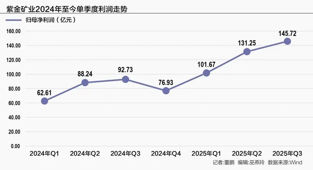 投资评级 - 对紫金矿业的投资评级为“买入”,并予以维持 [2][7] 核心观点 - 公司2025年第三季度业绩再创新高,表现超预期,主要驱动因素为产品价格上涨及产量增长 [7] - 矿产金业务贡献亮眼,其毛利占比已提升至40.4% [7] - 报告基于信用格局重塑下央行购金持续以及降息后黄金ETF规模增长将推动金价上行,同时供给扰动频繁将支撑铜价中枢上行的判断,上调了公司2025年至2027年的盈利预测 [7] - 考虑到公司在铜、金行业的头部地位及成长性,预计其将受益于量价齐升,业绩持续增长 [7] 财务业绩表现 - 2025年前三季度:实现营业总收入2542.0亿元,同比增长10.3%;实现归母净利润378.6亿元,同比增长55.4% [6][7] - 2025年第三季度:实现营业总收入864.9亿元,同比增长8.1%,环比下降2.6%;实现归母净利润145.7亿元,同比增长57.1%,环比增长11.0% [7] - 2025年前三季度毛利率为24.9%,同比提升;矿山企业毛利率高达60.6%,同比提升2.9个百分点 [6][7] - 盈利预测:预计2025年、2026年、2027年归母净利润分别为512.0亿元、631.9亿元、721.5亿元,对应市盈率分别为15倍、13倍、11倍 [6][7] 主要产品产量 - 2025年前三季度:矿产铜产量83万吨,同比增长5%;矿产金产量65吨,同比增长20%;矿产锌产量27万吨,同比下降12%;碳酸锂产量1.1万吨 [7] - 2025年第三季度:矿产铜产量26万吨,环比下降6%;矿产金产量24吨,环比增长7%;矿产锌产量9万吨,环比持平 [7] - 矿产金产量增长主要得益于新并购的加纳阿基姆金矿、新投产的新疆萨瓦亚尔顿金矿以及部分原有金矿处理量提升 [7] - 矿产铜产量环比下降主要受刚果(金)卡莫阿-卡库拉铜矿淹井事件影响 [7] 成本与售价 - 2025年第三季度成本:矿产金单位成本为280元/克,环比上升3%;矿产铜单位成本为2.54万元/吨,环比上升4%;矿产锌单位成本为1万元/吨,环比上升1% [7] - 成本上升主要原因为部分矿山品位下降、运距增加、部分露天矿山剥采比上升、黄金价格上涨导致权益金提升以及新并购企业处于过渡期成本较高 [7] - 2025年第三季度售价:矿产金销售均价为768元/克,环比上升4%;矿产铜销售均价为6.37万元/吨,环比上升2.6%;矿产锌销售均价为1.6万元/吨,环比上升9% [7] 项目进展与未来产能 - 铜矿项目:Timok下部矿带及博尔铜矿技改扩建项目正加快推进;卡莫阿铜矿受淹井事件影响,2025年产量指引下调至37-42万吨;巨龙铜矿二期预计2025年底建成,达产后年产铜30-35万吨;朱诺铜矿规划年产铜7.6万吨,预计2026年6月底投产;雄村铜矿规划年产铜4.6万吨 [7] - 金矿项目:哈萨克斯坦Raygorodok金矿已完成交割,资源量197吨,预计年均产金约6吨;苏里南罗斯贝尔金矿技改完成,达产后年产金约10吨;新疆萨瓦亚尔顿金矿正推进产能爬坡,预计年均产金约3.3吨;海域金矿在建,规划年产金15-20吨;加纳Akyem金矿年产金约5.8吨 [7] - 锂项目:阿根廷3Q项目一期2万吨已于2025年第三季度投产;西藏拉果错项目一期2万吨已于2025年第一季度末投产;湖南湘源锂矿规划年产3万吨,预计2025年第四季度试生产 [7]