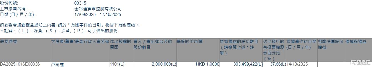 | 股份代號: | 03315 | | --- | --- | | 上市法國名稱: | 金邦達賽嘉控股有限公司 | | 日期 (日 / 月 / 年): | 17/09/2025 - 17/10/2025 | 格隆汇10月17日丨根据联交所最新权益披露资料显示,2025年10月14日,金邦达宝嘉(03315.HK)获主席、执行董事及首席执行官卢闰霆在场内以每股均价 1.00港元增持200万股,涉资约200万港元。 | 表格序號 | 大股東/董事/最高行政人員名稱作出披露的 買入 / 費出或涉及的 每股的平均價 | | | | | 持有權益的股份數目 佔已發行的 有關事件的日期 | | --- | --- | --- | --- | --- | --- | --- | | | | 原因 | 股份數目 | | | 【讀參聞上述 * 許 有投票權股 (日 / 月 / 年) | | | | | | | | 份百分比 | | | | | | | | (%) | | DA20251016E00036 | 即田立 | 1101(L) | | 2.000,000(L) | HKD 1.0000 | 303.499.422(L) ...