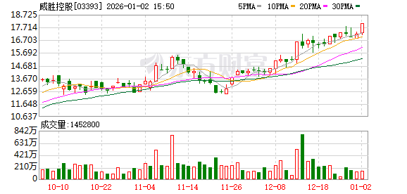 公司股价表现 - 威胜控股(03393.HK)尾盘涨近5%,盘中最高触及17.99港元,创下历史新高[2] - 截至发稿时,公司股价上涨4.37%,报收于17.93港元[2] - 当日成交额为2440.84万港元[2]