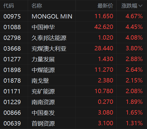 格隆汇10月30日|港股煤炭股普遍上涨,其中,中国神华盘初一度涨至6%,创下上市新高价,兖煤澳 大利亚涨3.8%,中煤能源、力量发展涨约3%,兖矿能源、中国秦发、首钢资源、南南资源均有涨幅。 国信证券研报称,在2024年中至今,前期由于煤价下行、煤企利润不佳导致,但是2025年下半年煤价反 弹后,煤企利润有望改善且四季度煤价具备向上弹性,叠加本轮市场转好后,煤炭板块表现明显弱于其 他板块,且底部明确,看好板块四季度反弹。 | 代码 | 名称 | 最新价 | 涨跌幅 √ | | --- | --- | --- | --- | | 00975 | MONGOL MIN | 11.650 | 4.67% | | 01088 | 中国神华 | 42.620 | 4.45% | | 02798 | 久泰邦达能源 | 1.020 | 4.08% | | 03668 | 兖煤澳大利亚 | 28.440 | 3.80% | | 01277 | 力量发展 | 1.430 | 2.88% | | 01898 | 中煤能源 | 11.270 | 2.64% | | 01878 | 南戈壁 | 2.380 | 2.15% | | 0 ...