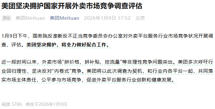 监管动态 - 2026年1月9日,国家市场监督管理总局发布公告,国务院反垄断反不正当竞争委员会办公室将对外卖平台服务行业市场竞争状况开展调查、评估 [1] - 调查评估将通过现场核实、当面访谈、问卷调查等方式,深入了解外卖平台竞争行为,全面调查市场竞争状况,并提出处置措施 [1] - 近段时间以来,外卖平台服务行业拼补贴、拼价格、控流量等问题突出,挤压实体经济,加剧行业“内卷式”竞争,社会各方面反映强烈 [1] - 2025年5月与7月,国家市场监督管理总局连续两次对三家外卖平台进行了约谈,要求公平有序竞争、合法规范经营 [1] 行业背景与先例 - 2025年初,京东、阿里巴巴高调宣布进军外卖,引发行业“外卖大战” [1] - 先行对重点行业进行调查评估,再出台健康有序发展政策已有先例,例如2024年对新能源、云服务和半导体行业进行了市场竞争状况评估,2025年新能源汽车等行业也成为反内卷重点领域 [2] 公司表态与行动 - 美团官方发布公告称,坚决拥护调查,将全力做好配合工作,并以此次调查为契机,和行业内各平台一起共同落实市场主体责任,公平参与市场竞争 [1] - 在连续三个季度的财报电话会及股东大会上,美团均公开表达了“坚决反对内卷”的态度 [2] - 据统计,在2025年期间,美团连续六次对“反对内卷”进行了官方表态与声明 [2]