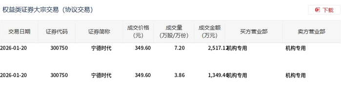 大宗交易概况 - 2026年1月20日,宁德时代发生大宗交易,总成交11.06万股,总成交金额3866.58万元,占该股当日总成交额的0.31% [1] - 该笔大宗交易的成交价格为349.6元,与当日市场收盘价持平 [1] 交易明细分析 - 当日大宗交易由两笔交易组成,第一笔成交7.20万股,成交金额2517.1万元 [2] - 第二笔成交3.86万股,成交金额1349.4万元 [2] - 两笔交易的买卖双方营业部均显示为“机构专用” [2]