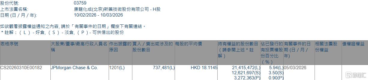 核心股东权益变动 - 2026年3月5日,JPMorgan Chase & Co.以每股均价18.1145港元减持康龙化成H股好仓73.75万股,涉及资金约1335.91万港元 [1] - 此次减持后,JPMorgan Chase & Co.持有的好仓数目由减持前的约2215.30万股(根据比例计算)降至2141.55万股,其持好仓比例由6.15%下降至5.94% [1] - 根据权益披露表格,截至2026年3月5日,JPMorgan Chase & Co.除持有2141.55万股好仓(长仓,标记为L)外,还持有1262.17万股淡仓(空仓,标记为S)及327.24万股可供借出的股份(标记为P) [2] 公司基本信息 - 此次权益变动涉及的公司为康龙化成(北京)新药技术股份有限公司的H股,股份代号为03759.HK [1][2] - 披露的权益变动数据覆盖期间为2026年2月10日至2026年3月10日 [2]