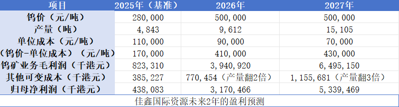 公司股价表现与市场定位 - 佳鑫国际资源自2025年8月28日上市首日股价暴涨177.84%后持续走强,截至1月16日最高触及75.5港元/股,较10.92港元/股的发行价累计涨幅超591.39% [1] - 在智通财经APP于2025年12月20日发布相关文章后的17个交易日内,公司股价最大累计涨幅达75% [1] - 公司当前市值已达320亿港元,市场对其“10倍股”潜力共识加速凝聚,并有望挺进千亿市值俱乐部 [1] 钨价市场行情与驱动因素 - 2025年中国钨市场主要钨制品价格累计涨幅超过220%,创下十余年来的最大年度涨幅纪录 [2] - 进入2026年,钨价继续上涨并突破重要关口:65%黑钨精矿价格报51万元/标吨(较年初涨10.87%),国内APT价格报75万元/吨(较年初涨11.94%),钨粉价格报1210元/公斤(较年初涨12.04%) [2] - 自元旦以来主要钨原料价格累计涨幅突破10%,显示钨价正处于持续上涨的主升浪中 [3] - 中金公司预计2023-2028年全球原钨生产量从7.95万吨增至8.99万吨,但需求将从9.62万吨增至11万吨,供需偏紧格局将持续,驱动钨价中枢持续上行至45-50万元/吨 [3] - 鉴于供给刚性收缩、需求新兴领域爆发等多重因素,业内乐观预期钨矿价格或有望升至55万元/吨,且2026年全球地缘政治复杂性可能进一步推升钨价 [3] - 2026-2027年,钨矿的长期价格中枢维持在50万元/吨已具有较高确定性,成为计算钨矿企业内在价值的关键锚点 [4] 公司资源与产能规划 - 佳鑫国际资源专注于开发哈萨克斯坦的巴库塔钨矿项目,截至2025年6月,该矿拥有1.07亿吨矿石量(品位0.211% WO₃),三氧化钨资源量达227.3千吨,是全球第四大WO₃资源量钨矿及全球最大的露天钨矿 [6] - 巴库塔钨矿一期生产目标为年处理330万吨矿石,已于2025年启动;2025年上半年处理矿石94.5万吨,生产钨精矿1205吨;下半年目标矿石产量165万吨,钨精矿3638吨;2025年全年计划钨精矿产量4843吨 [6] - 二期计划于2027年第一季度投产,届时年处理矿石能力将提升至495万吨 [7] - 根据第一上海证券预测,公司钨精矿产量2025年为4843吨,2026年随一期产能完全释放达7000吨,2027年二期部分投产后产能将增至1.1万吨;预计2025至2027年实际产量分别为4843吨、9612吨、1.51万吨 [7] 公司盈利预测与估值展望 - 第一上海证券预测,假设2025年钨矿平均价格为28万元/吨,单位成本为11万元/吨,公司2025年收入约为12.67亿港元,归母净利润为4.38亿港元 [7] - 假设2026、2027年钨矿中枢价格维持在50万元/吨高位,且其他可变成本线性外推,公司2026、2027年的归母净利润或有望分别达31.7亿、53.4亿港元 [7] - 具体预测数据:2025年钨价28万元/吨,产量4843吨,单位成本11万元/吨,归母净利润4.38亿港元;2026年钨价50万元/吨,产量9612吨,单位成本9万元/吨,归母净利润31.7亿港元;2027年钨价50万元/吨,产量15105吨,单位成本7万元/吨,归母净利润53.4亿港元 [8] - 从2025年到2027年,公司归母净利润或有超10倍的增长幅度;若给予2026年30倍估值,对应市值或有望升至千亿级别,较当前市值仍有3倍成长空间 [8] 公司成长路径与关键节点 - 周期行业大牛股股价上涨普遍沿“估值修复—价格驱动—业绩兑现”三阶段演进,佳鑫国际资源目前正处于产品涨价推动股价的主升浪第二阶段 [5] - 中长期来看,公司股价有望在产能释放验证长期逻辑的推动下再创新高,业绩精准测算成为投资决策的关键锚点 [5] - 投资者需关注几个关键节点:2025年业绩是否符合预期、50万元的钨矿价格中枢能否维持、量产目标能否顺利推进;若“价”稳“量”达,公司朝千亿目标迈进的概率将显著增强 [9]