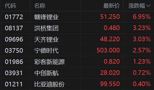 港股异动丨锂电池股强势 赣锋锂业涨超7% 天齐锂业涨超3% 12月锂电排产印证涨价逻辑