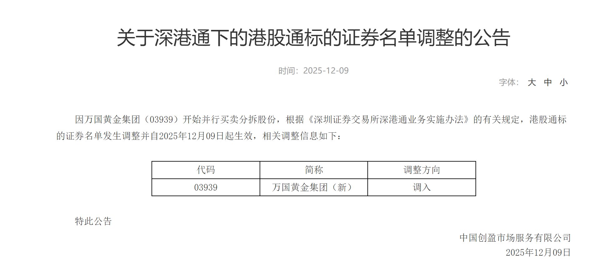 公司事件 - 万国黄金集团(03939 HK)开始并行买卖分拆股份 [1] - 深交所因此调整港股通标的证券名单 [1] - 调整自2025年12月09日起生效 [1]