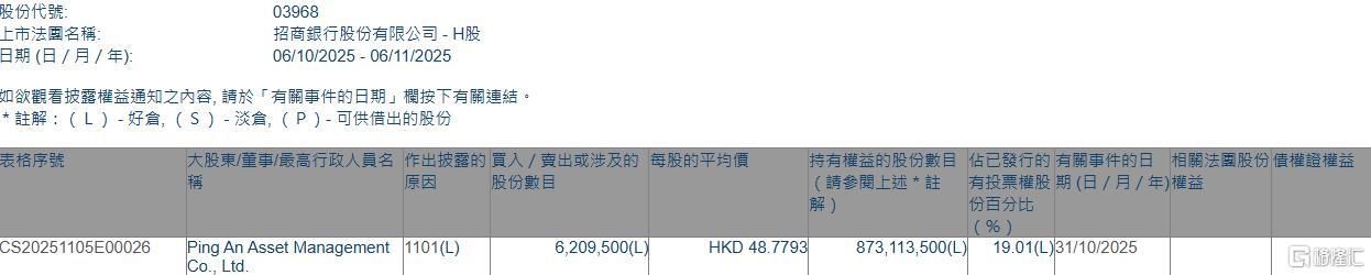 | 表格序號 | 大股東/董事/最高行政人員名 作出披露的 買入 / 費出或涉及的 每股的平均價 | | | 持有權益的股份數目 佔已發行的 有關事件的日 相關 | | --- | --- | --- | --- | --- | | | 股份數目 | | | (語學 中 有投票權股 期(日/月/年)權益 | | | | | | 份百分比 | | | | | | OF | | CS20251105E00026 | Ping An Asset Management 1101(L) | 6,209,500(L | HKD 48.7793 | 873,113,500(L) 19.01(L)31/10/2025 | | | Co., Ltd. | | | | 格隆汇11月6日丨根据联交所最新权益披露资料显示,2025年10月31日,招商银行(03968.HK)获Ping An Asset Management Co., Ltd.在场内以每股均价48.7793 港元增持620.95万股,涉资约3.03亿港元。 增持后,Ping An Asset Management Co., Ltd.最新持股数目为873,113,500 ...